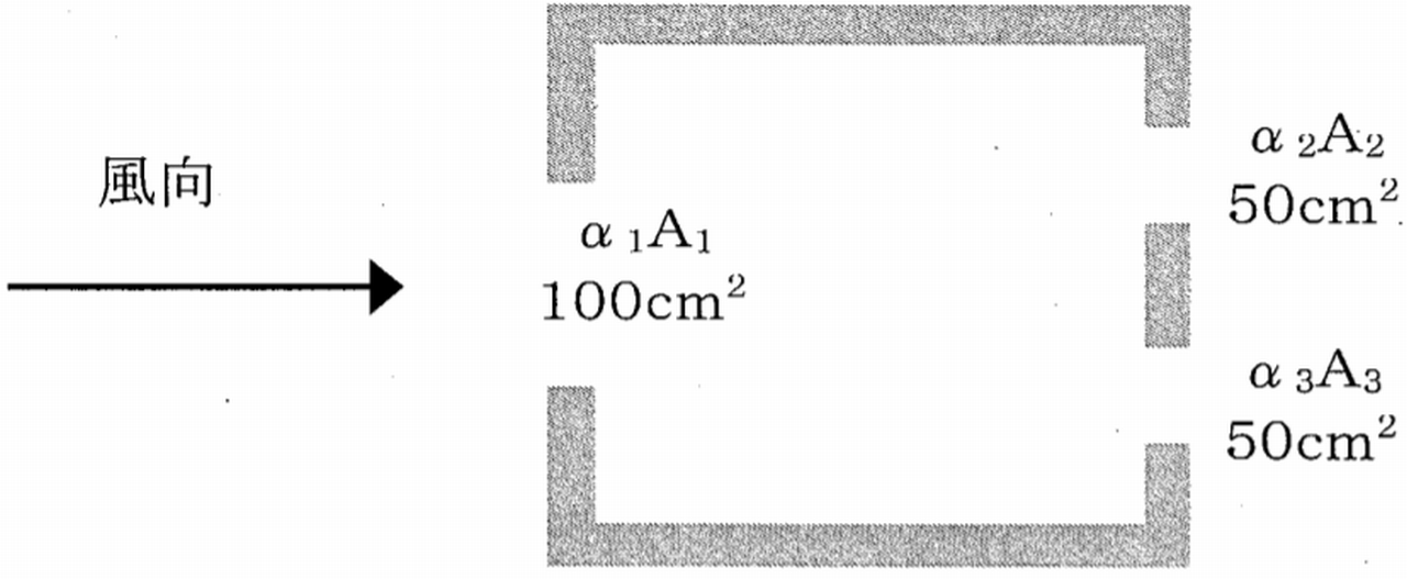二面開口住戸の通風・ 換気性能について, 風上開口の相当開口面積α1A1, 風下開口の相当開口面積α2A2, α3A3が下図に示す値である場合, これらを合成した相当開口面積(合成αA)に最も近い値はどれか。